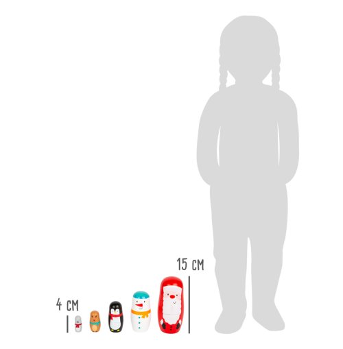 Láskyplně malované figurky v podobě Santa Clause, sněhuláka, tučňáka, soba a medvěda. Podle velikosti se postupně figurky schovávají do sebe. Hlavní vlastnosti: navozují vánoční atmosféruideální dárek ve vánočním obdobípodporuje koordinaci ruka-oko a jemné motorické dovednosti