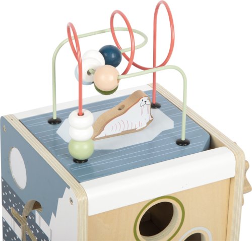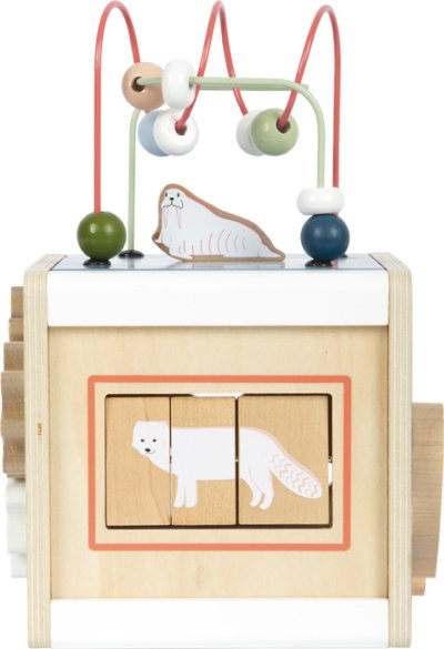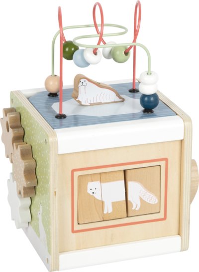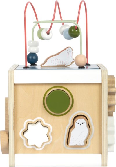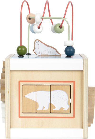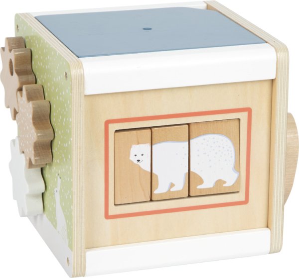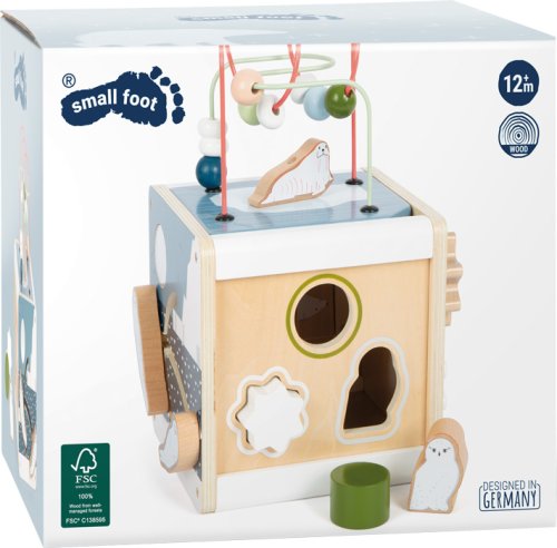 Motorická zábava s polárním králíkem, ledním medvědem, tuleňem a všemi jejich přáteli. Tato motorická kostka je vyrobená ze 100% certifikovaného dřeva FSC®. Nabízí toho spoustu k prozkoumání na svých pěti hratelných stranách. Například dvě korálková bludiště, vkládání tvarů, posuvné bludiště, točící se destičky nebo ozubená kolečka. Poskytuje tak dětem dlouhotrvající zábavu a rozmanité příležitosti k učení. Tuleň, mrož, lední medvěd a další arktická zvířata doprovázejí malé průzkumníky na každé straně kostky a zábavnou formou vzbuzují zvědavost. Motorická kostka má odnímatelné víko, takže lze uložit dovnitř kostky zvířátka nebo tvary, které dítě zrovna nepoužívá .Otáčení, vkládání, posouvání, točení, zkoumání inspiruje fantazii, ale také trénuje zručnost, jemnou motoriku a rozpoznávání barev a tvarů a zároveň učí principu příčiny a následku. Díky svým moderním barvám, vysokému množství dřevěného materiálu a arktickým vzorům je tato kostka skutečným poutačem v dětském pokoji. Má zaoblené hrany pro příjemný haptický zážitek. Hlavní vlastnosti: rozvíjí motoriku, senzorické funkce, poznávání barev a tvarů100% FSC® dřevomoderní originální designzaoblené hrany Značka a certifikát FSC® (Forest Stewardship Council) zaručuje, že dřevo, ze kterého byl produkt vyroben, nebylo vytěženo nelegálně a pochází z lesů obhospodařovaných šetrným či přírodě blízkým způsobem, ve kterém jsou dodržovány přísné environmentální a sociální požadavky. Značka FSC® na výrobku znamená, že svým nákupem pomáháte chránit lesy a podporujete šetrné, odpovědné či přírodě blízké hospodaření, díky kterému jsou naše lesy stabilnější, zdravější, mají přirozenou druhovou skladbu a lépe odolávají negativním následkům klimatických změn.