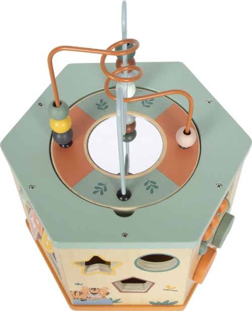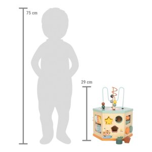 Tato motorická kostka z robustního dřeva s motivem safari nabízí spoustu činností a zábavy na sedmi různorodých plochách. Zaujme kombinací obrázků zvířátek v příjemných barvách se vzhledem přírodního dřeva. Nabízí nepřeberné množství aktivit, které stejnou měrou podporují jemnou i hrubou motoriku, jako je labyrint s barevnými korálky, posuvné labyrinty, zrcátko, vkládací kostky různých tvarů, malé korálkové počítadlo, xylofon, ozubená kolečka a další. Díky praktickému úložnému prostoru uvnitř kostky se vkládací tvary neztratí a odnímatelné víko lze otočit korálkovým labyrintem dovnitř, aby se ušetřilo místo. Palička na xylofon je ke kostce připevněna gumovým poutkem. Tuto všestrannou kostku motorických dovedností lze doplnit dalšími dřevěnými hračkami z řady Safari. Hlavní vlastnosti: atraktivní motiv safarivelké množství aktivit na 7 stěnách praktický úložný prostor na vkládací tvaryvíko s labyrintem je možné otočit dovnitřrozvíjí jemnou i hrubou motoriku ideální doplněk k dalším hračkám řady Safari