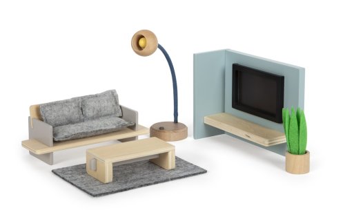 Je libo podívat na televizi nebo jen tak posedět na pohovce? Tento obývací pokoj je nejen krásným doplňkem pro každý domeček pro panenky, ale také motivuje děti ke kreativní hře a rozvíjí jejich představivost. Je vyroben tak, aby co nejvíce odpovídal skutečnému nábytku. Součástí je pohovka se 3 polštáři, ohebná vysoká stojací lampa, příjemný kobereček, konferenční stolek, rostlina v květináči, panel s televizí s plochou obrazovkou a policí a 2 oboustranné karty s obrázkem. Kartu lze zasunout do prostoru televize jako obrazovku a děti si tak mohou změnit televizní program. Hlavní vlastnosti: moderní a elegantní nábytek do obývacího pokoje2 oboustranné vkládací karty s obrázkem pro změnu programu v televiziohebná vysoká stojací lamparozvíjí fantazii a motivuje ke kreativní hře