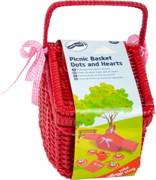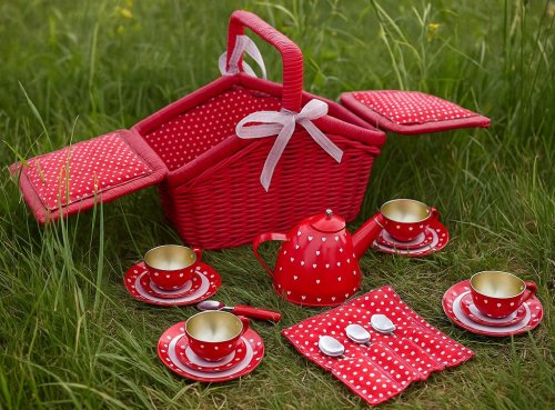 Tento proutěný košík obsahující plechovou čajovou soupravu s motivem srdce si můžete vzít na každý čajový dýchánek! Koš má pásky se suchými zipy, je lemovaný puntíkovanou látkou a zdobený malými stuhami. Sada obsahuje: 1 piknikový koš, 1 podnos na příbory, 1 konvice, 4 velké talíře, 4 malé talíře, 4 šálky, 4 lžíce Hlavní vlastnosti: kompletní čajová sada v košíkuobsahuje 18 dílů