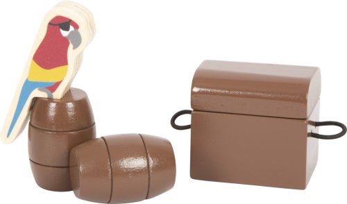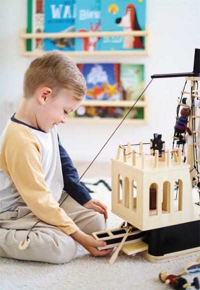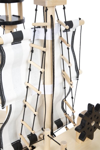Ahoj piráti! Tato propracovaná pirátská loď vyrobená z robustního dřeva splní přání díky mnoha autentickým detailům. Loď obsahuje také člun, na kterém mohou veslovat dva pohybliví piráti. Obsahuje také žraloka, papouška, truhlu s pokladem, dělo, dva sudy, prkno, vlajku. Všechny plachty lze zvednout a vytáhnout pomocí lan, stejně jako na skutečné lodi. Dělo, které vystřeluje své tři plstěné dělové koule vzduchem, přidává další dávku zábavy. Hrací sada s velkou pirátskou lodí se ideálně hodí pro hru plnou fantazie pro odvážné bukanýry, kteří prozkoumávají moře, objevují nové země a vydávají se na lov pokladů! Interiér pirátské lodi nabízí spoustu úložného prostoru pro všechny nalezené poklady a také truhlu s pokladem na obzvlášť cennou kořist. Pohyblivá kotva připevněná k lanovému navijáku, provazové žebříky, jeřáb, padací dveře na palubě a poklop na zádi, to vše poskytuje příležitost pro realistickou hru. Když má být loď odložena prostorově úsporným způsobem, lze zábradlí a stěžně lodi snadno odstranit. Vhodné pro figurky do velikosti 12 cm. Hlavní vlastnosti: rozvíjí motoriku a komunikační dovednosti dětípropracované funkční prvkyjeřáb s hákem pro vyzvedávání kořistifunkční dělo včetně 3 plsťěných koulídva pohybliví piráti