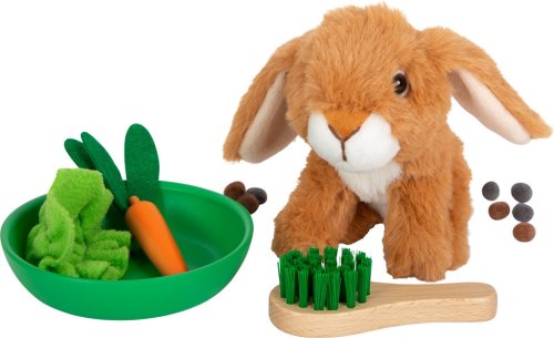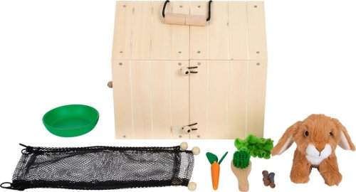 Roztomilý přístřešek a v něm ještě roztomilejší čumáček! Králíkárna ze stabilního dřeva (kterou lze použít i pro přepravu) se skládá ze dvou malých boudiček, jenž lze za pomoci smyček propojit. V jedné polovině může plyšový králík nerušeně spát a na druhé straně se přes síť může rozhlížet po svém okolí. K boudám lze připojit dva pletivové ploty a vytvořit tak venkovní výběh. Díky četnému příslušenství je výběh pro králíky okamžitě připraven ke hře a poskytuje realistické situace při hraní rolí. Pokud děti ještě nemohou mít skutečného mazlíčka, pak je tato sada dokonalou alternativou! Děti mohou totiž trénovat důležité sociální a emocionální dovednosti při předstírání péče o zvíře. Balení obsahuje plyšového králíka, smetáček, misku, mrkev ze dřeva a plsti, kousek salátu a pár plstěných bobků. Černou stěnu na zadní straně boudy lze za pomoci křídy popsat. Hlavní vlastnosti: děti se učí nést zodpovědnost za své mazlíčkyvčetně doplňků a potřebpodporuje kreativitu