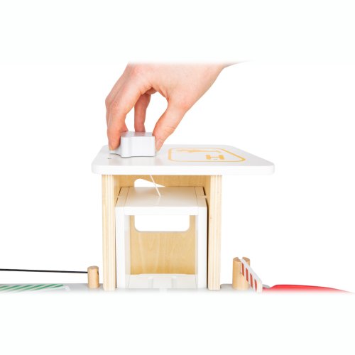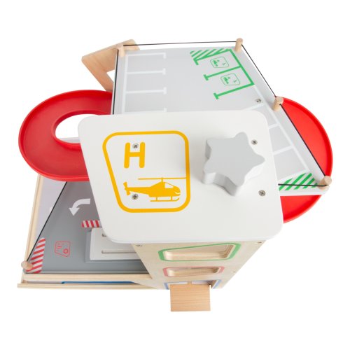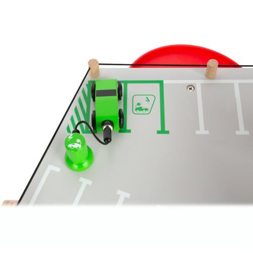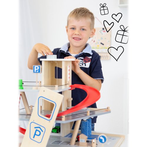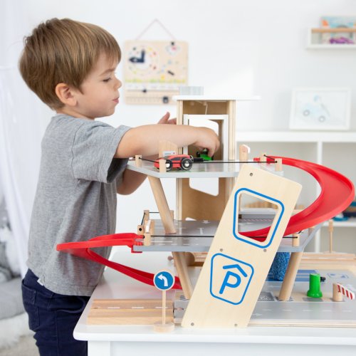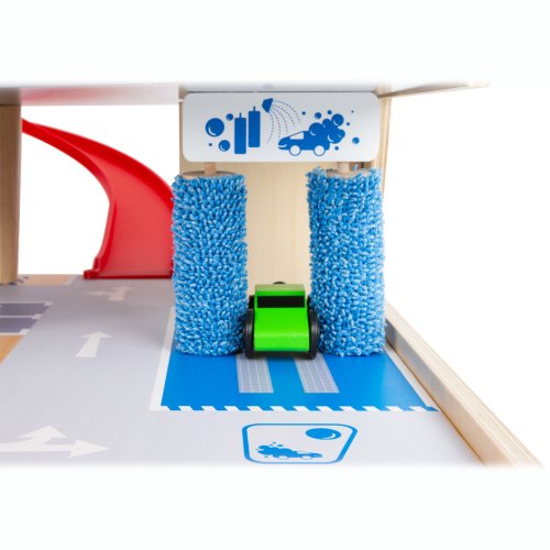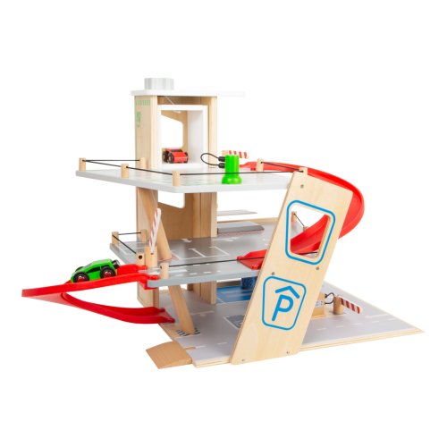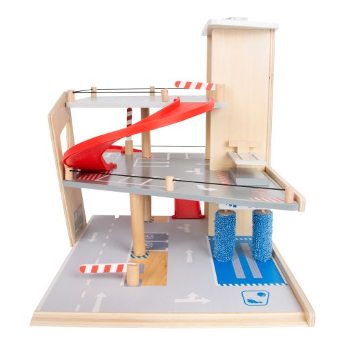 Parkujte, tankujte, myjte nebo opravujte, a to vše s jednou garáží! Nabízí tři bohatě vybavená podlaží propojená atraktivním funkčním výtahem a zábavnými, na sebe plynule navazujícími rampami. Její součástí je dvojice autíček, která mohou při fantastických hrách využít pumpy, nabíjecí stanice, zvedací rampy, nebo myčky s realistickými kartáči. Každá z úrovní je navíc opatřena mechanickou závorou pro dokonale poutavé zážitky. Patra jsou opatřena gumovým hrazením, které dodávají jízdě autíček na dynamice a brání jejich vypadnutí. Garáž je podrobně zdobena mnoha barevnými ikonami a značením, které do her vnese i poučení. Je vyrobena ze silné, pevné a odolné dřevěné překližky s doplňky z masivního dřeva a nezávadného plastu. Výrobek vyžaduje montáž, dodáváno s obrázkovým návodem k sestavení. Hlavní vlastnosti:garáž a 2 autíčka3 podlaží propojená funkčním výtahem a 2 rampamipumpa, nabíjecí stanice, zvedací rampa, myčka a 3 závorykompatibilní s vláčkodráhami a souvisejícím příslušenstvím jiných výrobcůbohatě zdobeno jednoduchými ikonami a značenímpevné a odolné dřevěné provedení