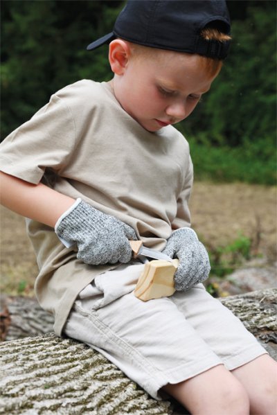 Chceš štípat klacíky, krájet ovoce nebo si připravit klacek na opékání? S outdoorovým dětským nožem to není žádný problém! Díky krátké, robustní čepeli s tupou špičkou, kompaktním rozměrům a dřevěné rukojeti dokonale tvarované pro dětské ruce mohou děti získat první zkušenosti s vyřezáváním a manipulací s nožem. Nůž je bezpečně uložen v látkovém pouzdře s háčky a poutky pro připevnění k opasku. Sadu doplňuje pár speciálních rukavic odolných proti pořezání a dřevěný řezací špalíček. Čepel tohoto outdoorového nože je ostrá, protože tupé čepele nejsou v žádném případě bezpečnější než ostré! Při řezání tupým nožem musíte použít mnohem více síly, což zvyšuje riziko vyklouznutí nože a zranění. Dětské nože na vyřezávání by samozřejmě měly být i tak vždy používány pod dohledem dospělých a v rámci pevně stanovených pravidel. Nože nejsou hračky, ale nástroje! Jsou ideální pro výlety do přírody, dobrodružství a expedice - protože s dětským outdoorovým a průzkumným vybavením se svět za dveřmi stane vzrušujícím místem plným dobrodružství! Hlavní vlastnosti: obsahuje 5 kskrátká, robustní čepel (jednostranně broušená) a tupá špička noževybavení vhodné zejména do přírody a na průzkum