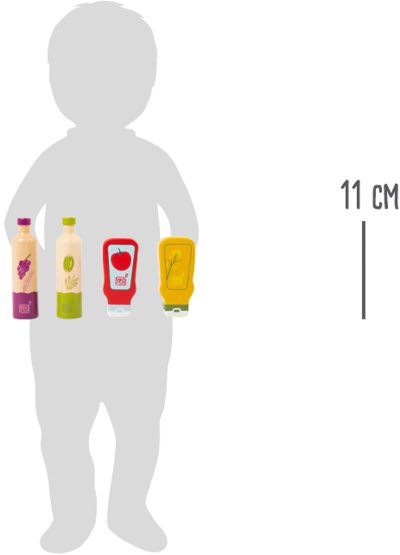 To správné koření do dětské kuchyňky! Herní set obsahuje lahvičky z kvalitního dřeva v typických barvách daného produktu. Díky výrazným ilustracím na lahvi dítě jejich obsah snadno rozpozná. Set obsahuje ocet, olej, kečup a hořčici. Hlavní vlastnosti: sada obsahuje 4kspodporuje představivost a hraní rolí