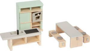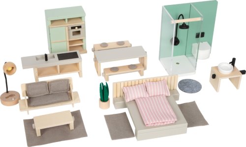 Tato kompletní sada nábytku promění každý domeček pro panenky v moderní a útulný domov. Nabízí vybavení pro všechny hlavní místnosti a vyniká skandinávským designem v jemných barvách s výrazným podílem přírodního dřeva a moderními detaily.Ložnice je vybavena manželskou postelí se společnou přikrývkou, polštáři a koberečky, které vytvářejí příjemné místo pro odpočinek. Koupelna nabízí moderní prvky včetně sprchy typu rainshower s akrylátovou zástěnou, závěsného WC a umyvadla na desce. Kuchyně zaujme kuchyňským ostrůvkem s dřezem a varnou plochou a také vysokou skříní s lednicí a troubou.Jídelna je zařízena stolem, lavicemi a pohodlnými podsedáky, zatímco obývací pokoj doplňuje pohovka, oblouková lampa, koberec, konferenční stolek a rostlina, které společně vytvářejí útulnou atmosféru pro každodenní hru.Sada je vhodná pro ohebné panenky do velikosti 12 cm a podporuje rozvoj fantazie i kreativní hry. Hlavní vlastnosti: kompletní sada nábytku do domečku pro panenkyložnice: manželská postel, přikrývka, polštáře, koberečkykoupelna: sprcha typu rainshower, akrylátová zástěna, závěsné WC, umyvadlokuchyně: kuchyňský ostrůvek s dřezem, vysoká skříň s lednicí a trouboujídelna: stůl, lavice, podsedákyobývací pokoj: pohovka, oblouková lampa, koberec, konferenční stolek, rostlinavhodné pro panenky do velikosti 12 cmskandinávský design v jemných barváchvysoký podíl přírodního dřevamoderní detailní zpracovánípodporuje hraní rolí a představivost