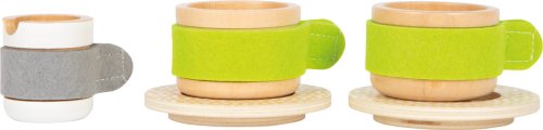 Všichni přátelé čaje a milovníci kávy pozor. Tato sada byla navržena s ohledem na nejmenší hostitele, kteří rádi imitují dospělé při přípravě kávy a čaje. Sada má krásný design, zajímavé detaily, vysoké množství dřevěných materiálů a hapticky příjemné plstěné kousky. Dva šálky s podšálky, dvě lžičky, cukřenka, konvička na mléko a velká konvice na kávu/čaj jsou doplněny talířem a sendvičovými sušenkami. Na cukřence a konvici na kávu/čaj je odnímatelné víko pro ještě vetší realistickou hru. Podporuje rozvoj představivosti a sociálních dovedností. Hlavní vlastnosti: podporuje kreativitu a sociální dovednostivyrobeno ze dřeva a plstěných doplňkůskvělý doplněk do dětské kuchyňkyhapticky příjemné plstěné kousky