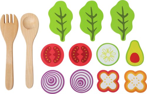 Dnes máme salát! Rajčata, cibule, avokádo, hlávkový salát, okurky a olivový olej jsou vyrobeny z masivního dřeva a díky své velikosti jsou dětskou ručkou snadno uchopitelné. Všechny ingredience lze zamíchat v plastové misce. Servírujeme, dobrou chuť! Hlavní vlastnosti: 11 ks zeleniny, olivový olej, servírovací příbor a miskapodporuje hraní rolí a vztah ke zdravé výživě
