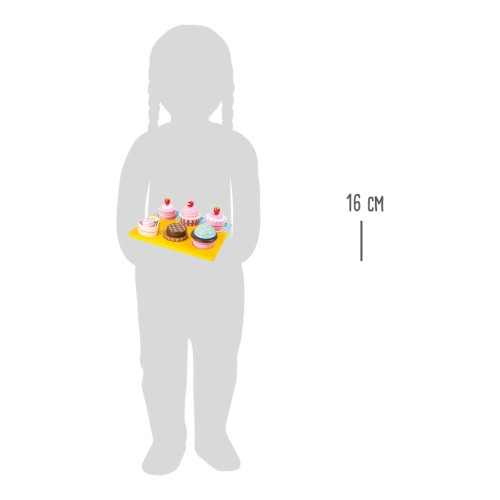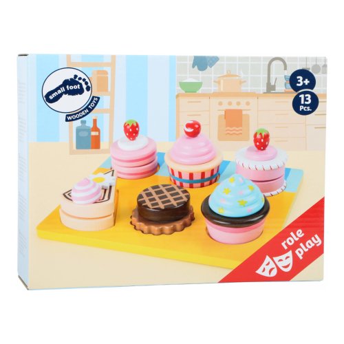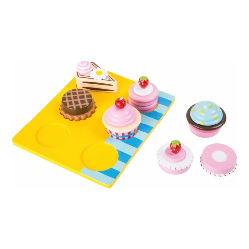 Nebraňte se a nabídněte si, s těmito sladkostmi neztloustnete! Souprava maket rozmanitých zákusků pro všechny mlsné jazýčky. Jejich pomocí lze zpestřit hry na hostitele podávající občerstvení váženým návštěvám, nebo na prodavačky a prodavače, různé stánky a obchody. Prostřednictvím těchto her si mohou děti osvojit způsobné společenské chování či pravidla servisu, a rozvíjet tak cenné komunikační dovednosti. Každý zákusek je sestaven ze dvou dílů spojených suchým zipem, které lze mezi sebou kombinovat. Děti tak mohou dát volný průchod své fantazii i při přípravě. Všechny součásti jsou vyrobeny z odolného dřeva a dekorovány pestrými nezávadnými barvami. Hlavní vlastnosti: 13 dílů celkem; podnos a 6 zákusků2 dílné zákusky možno vzájemně kombinovatrobustní a odolné dřevěné provedení
