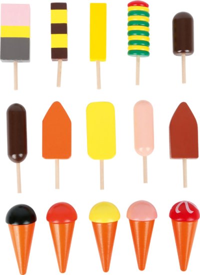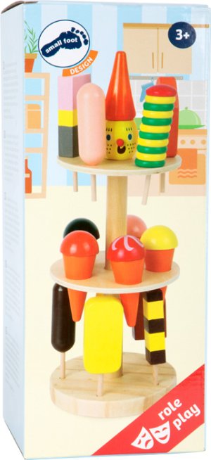Děti pojďte do cukrárny. Tento třípatrový stojan má vše na co máte chuť. Zmrzlina na špejli nebo v kornoutku (8-10 cm) se dá aranžovat do připravených otvorů. Tento zmrzlinový stojan nabízí celkem 15 různých a barevně zdobených zmrzlinových příchutí. Je vyroben z barevně lazurovaného masivního dřeva a překližky. Prostě “cool” doplněk pro dětské kuchyně nebo obchodu s potravinami. Hlavní vlastnosti: vyrobeno ze dřevaobsahuje 15 dílůpodporuje hraní rolí v kuchyňkách a obchodech