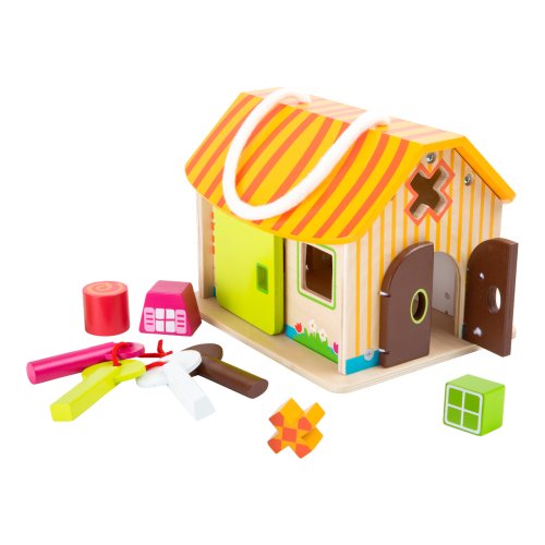 Tento dřevěný dům je výborný k procvičení motorických dovedností dětí. Každý klíč pasuje do jiných dveří. Díky gumičkám zůstanou otevřené. Cihly mají různé tvary, které je třeba vložit do správného otvoru. K přepravě domečku slouží šňůrka. Hlavní vlastnosti: obsahuje 9 dílkůprocvičení motorických dovednostípestrobarevné provedení