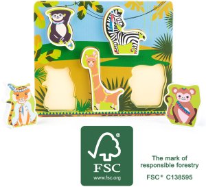 Barevná dětská vkládačka s obrázky veselých zvířátek z džungle. Vkládačka děti učí všímavosti, rozvíjí představivost a paměť. Dřevěná podložka usnadňuje skládání a rámečky zabezpečují, aby jednotlivá dřevěná zvířátka držela na svých místech. Děti se mohou učit poznávat divoká zvířátka. Vhodné pro děti od 12 měsíců.