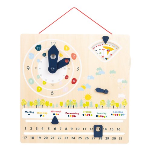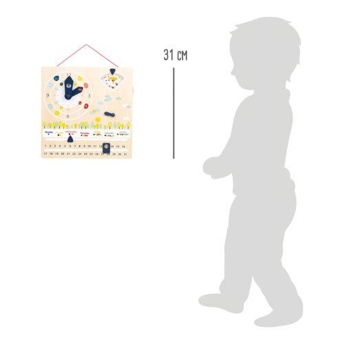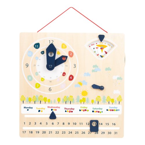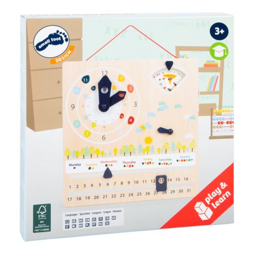 Barevná tabule od výrobce Small Foot z řady dřevěných hraček, které podporují rozvoj dítěte. Kalendář nebo hodiny? Obojí! Tyto učební hodiny vyrobené ze dřeva podporují děti, aby se naučily poznávat čas ve 12hodinových a 24hodinových časových systémech a zároveň hravě předávaly znalosti o počasí, dnech v týdnu, měsících a ročních obdobích s pomocí jednoduchých ilustrací.