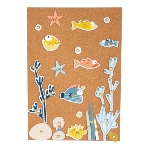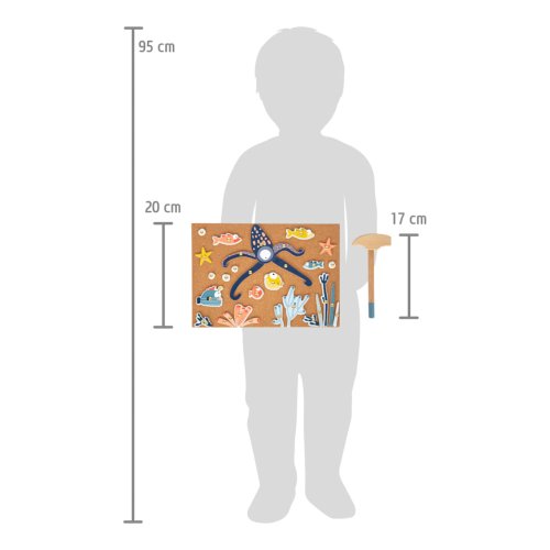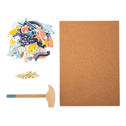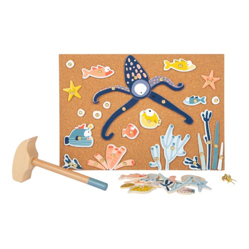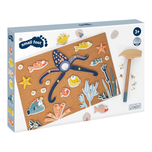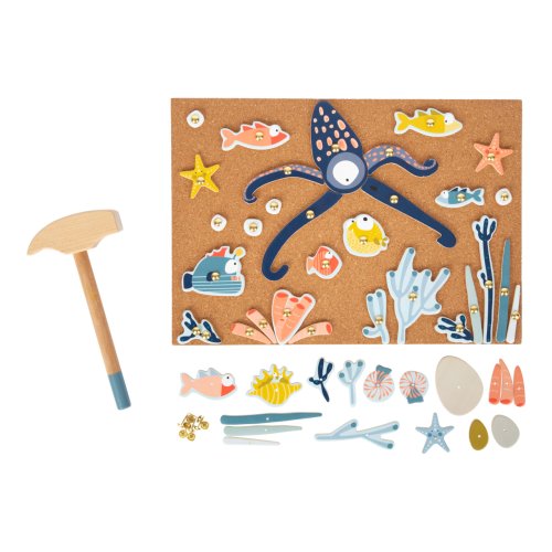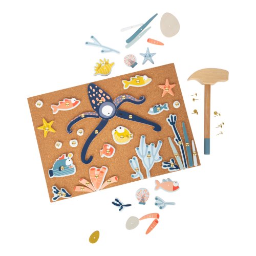 Hra pro všechny, kdo se nebojí sestoupit pod hladinu. Tvořte pomocí kladívka a hřebíčků rozmanité scény života v mořích. Dílky různých tvarů a sytých barev upoutají pozornost a podnítí fantazii dětí. Jejich upevňováním na korkovou desku pomocí kladívka mohou děti rozvíjet svou zručnost, jemnou motoriku i koordinaci rukou a zraku. Pro opakované použití a delší životnost jsou dílky opatřeny vrstvou odolného laminátu. Hřebíčky jsou přizpůsobeny neobratným dětským ručkám a opatřeny velkými hlavičkami, aby bylo snadné je trefit kladívkem, nebo scénu rozebrat. Hlavní vlastnosti:deska, dílky s potiskem, kladívko a hřebíčkyodolné provedení