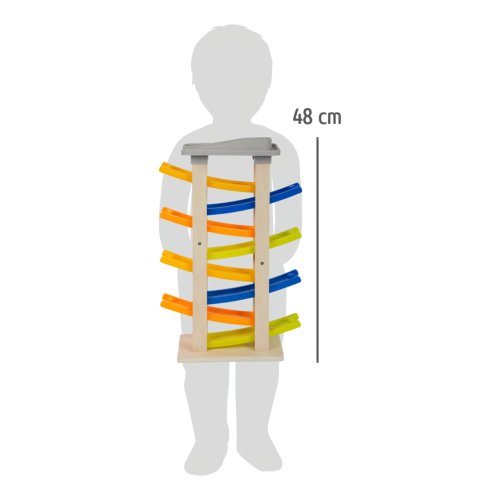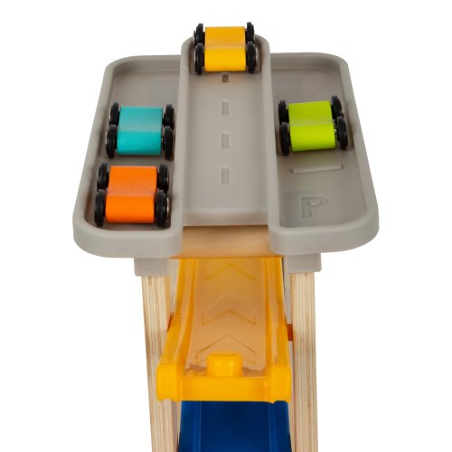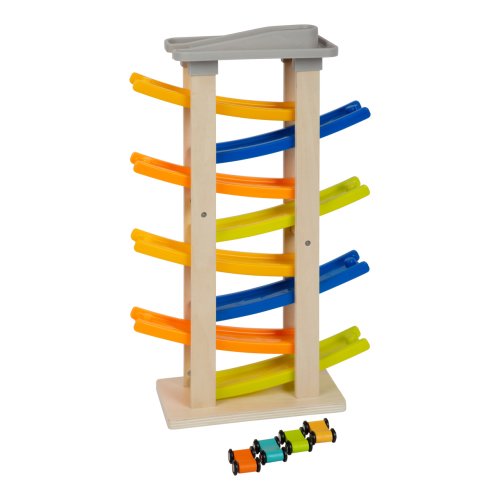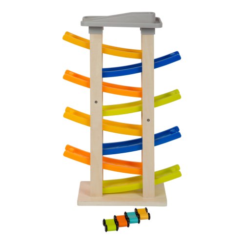 Neobvykle vysoká závodní dráha s osmi rampami a výjezdem do ulice! Na nejvyšším patře je místo pro parkování se čtyřmi barevnými dřevěnými autíčky. Klapací zvuky, které auta vydávají při sjezdu po rampě podporují akustické vnímání dětí. Dále hračka trénuje motoriku a koordinaci ruka-oko. Má širokou základnu, je tak velmi stabilní, je vyrobena z přírodního neošetřeného dřeva a pevného plastu. Pestrobarevný design vhodný pro děti. Hlavní vlastnosti: Dřevo, plastTrénuje motoriku a koordinaci ruka-okoV balení 4 dřevěná autíčka