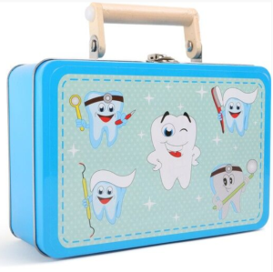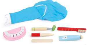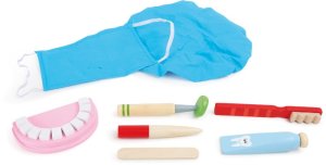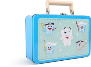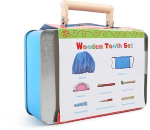 Nebojte se zubaře! S touto dřevěnou zubařskou sadou se děti mohou připravit na další návštěvu u zubaře a zkontrolovat, zda mají medvídci a panenky zuby v pořádku. S rouškou a látkovou čepicí se děti během chvilky promění ve skutečné zubaře. Díky kovovému kufříku je sada ideální i na cesty. Pokud chcete své děti připravit na zubaře, s touto herní sadou to hravě zvládnete. Balení obsahuje: roušku, čepici, zuby, kartáček, pastu, zrcátko a dašlí náčiní