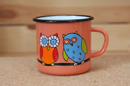 Smaltovaný hrnek 8cm - korálová / meruňková - sova