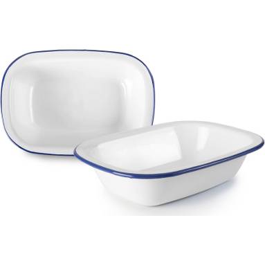 Smaltovaný pekáček s ozdobnou modrou linkou. Průměr 22 cm.