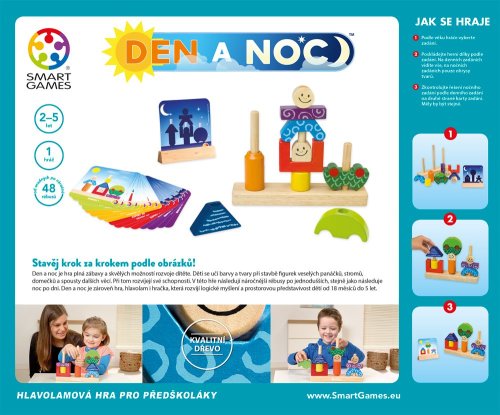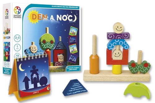 Hlavolamová hra pro 1 hráče z řady SMART games. Den a noc je hra plná zábavy a skvělých možností rozvoje. Děti se učí barvy a tvary a při stavbě figurek veselých panáčků, stromů, domečků a spousty dalších věcí. Při tom rozvíjejí své schopnosti. V této hře následují náročnější rébusy po jednodušších, stejně jako následuje noc po dni. Den a noc je zároveň hra, hlavolam i hračka, která rozvíjí logické myšlení a prostorovou představivost dětí od 18 měsíců do 5 let.