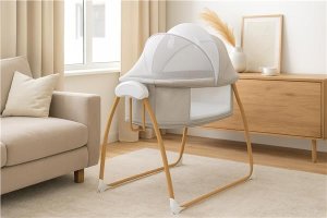 Potah kolébky je vyroben z prodyšného a na dotek příjemného materiálu, který lze snadno sundat a vyprat.
