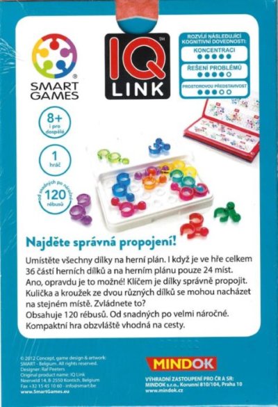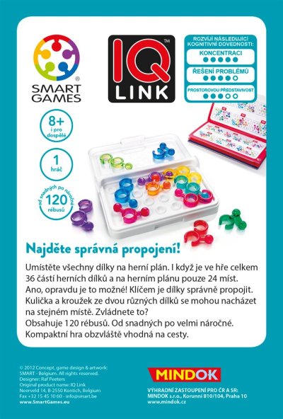 Hlavolamová hra pro 1 hráče z řady SMART games. Najděte správná propojení! Umístěte všechny dílky na herní plán. I když je ve hře celkem 36 částí herních dílků a na herním plánu pouze 24 míst. Ano, opravdu je to možné! Klíčem je dílky správně propojit. Kulička a kroužek ze dvou různých dílků se mohou nacházet na stejném místě. Zvládnete to? IQ link je krásná a kompaktní hra, ideální na cesty. A hlavně velká výzva pro váš mozek.