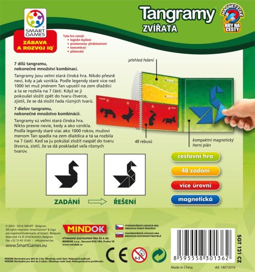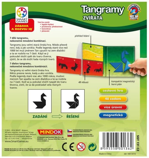 Hrejte si i na cestách. Zadání, herní plán i řešení jsou spojeny kroužkovou vazbou. Celá hra je navíc magnetická, nemusíte se proto bát, že Vám dílky budou při hře sjíždět. Tangramy jsou velmi stará čínská hra. Nikdo přesně neví, kdy a jak vznikla. Podle legendy staré více než 1000 let muž jménem Tan upustil na zem dlaždici a ta se rozbila na 7 částí. Když se ji pokoušel složit zpět do tvaru čtverce, zjistil, že se dá složit řada různých tvarů. Hra Tangramy: Zvířata patří do skupiny víceúrovňových, logických her Smart games , které jsou určeny především pro jednoho hráče (nicméně hru může hrát i hráčů více). Logické hry Smart Games obsahují vždy zadání v několika různých stupních obtížnosti, rozvíjí IQ, logické myšlelní, prostorovou představivost, koncentraci a plánování.