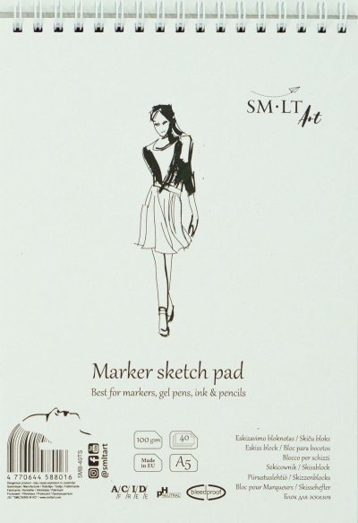 Blok s bílým, jednostranně nepropustným potahovaným papírem, 100g/m2. Povrch je hladký a je vhodný zejména pro popisovače a gelová pera. S přírodním kartonovým obalem, pevnou zadní stranou a spirálou na horní straně. Vnitřní papír je bez kyselin, pH neutrální a má certifikát FSC.