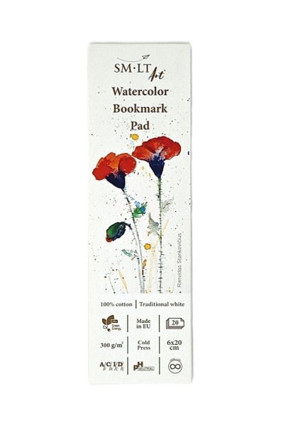 Akvarelová záložka do knihy PRO „SMLT ART“. Velikost 6x20 cm, 300g/m2, 20 listů. Lepené s tvrdým hřbetem. Přírodní bílý akvarelový papír ze 100% bavlny. Povrchová textura Cold Press má vynikající schopnost vyzdvihnout barvu. Tento papír je ceněn profesionálními i amatérskými tvůrci a nabízí dobrou kvalitu za přijatelnou cenu. Jedná se o papír s dlouhou životností, bez kyselin, s neutrálním pH.