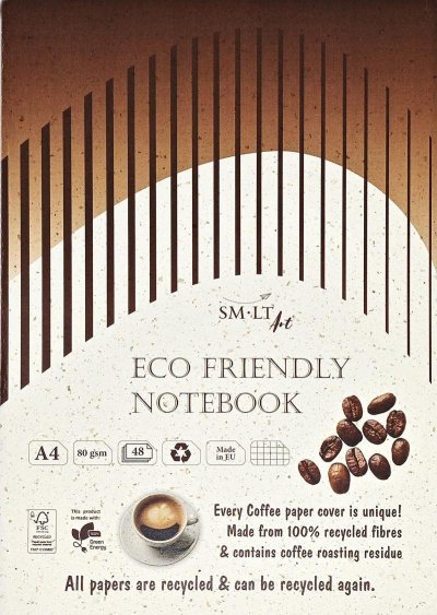 Šitý eko zápisník se čtverečky. Vyroben ze 100% recyklovaného papíru a může být znovu recyklován. Vnitřní papír obsahuje zbytky po pražení kávy. Zápisník je šitý, má 48 listů, 80g/m2.