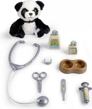 Sada obsahuje: vozík,kufřík s boxem, plyšovou pandu, misku, injekční stříkačku, teploměr, náramek, obvaz, nůžky, 2 lahvičky a stetoskop.