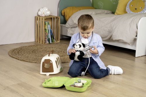 Sada obsahuje: kufřík s boxem, plyšovou pandu, misku, injekční stříkačku, teploměr, náramek, obvaz, nůžky, lahvičky a stetoskop.
