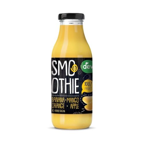 • Ovocné smoothie DEVA vyrobené z kvalitního ovoce (banán, mango, pomeranč, jablko), bez přidaného cukru a s přidaným vitamínem C, vhodné jako lahodná svačina
