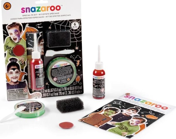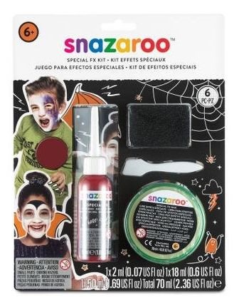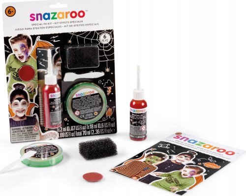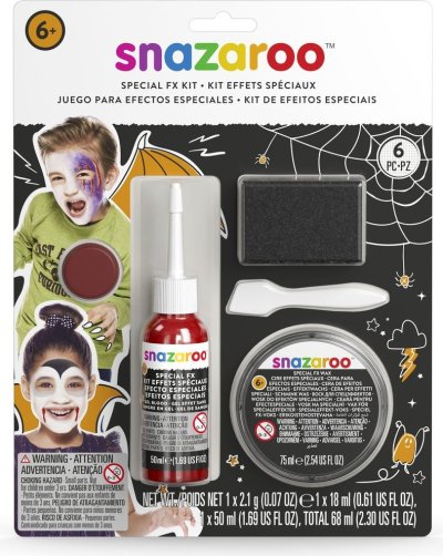 doplněk k malování na obličej ideální na Halloween, pálení čarodějnic nebo party FX vosk 18 ml pro vytvoření falešných zranění, bradavic, čarodějnických nosů FX falešná krev 50 m l pro přesvědčivě vypadající rány vínově červená barva Snazaroo 2 ml pro tvorbu modřin a odřenin další příslušenství: špachtlička pro roztírání vosku, houbička na speciální efekty, obrázkový návod bezpečné a netoxické , vhodné i pro citlivou kůži lehce odstranitelné - omyvatelné vodou a mýdlem