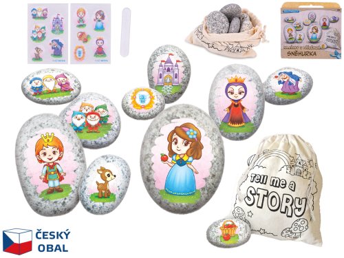 V krabičce najdete 10 pečlivě vybraných přírodních kamínků se samolepkou s postavičkami a prvky z pohádky Sněhurka.