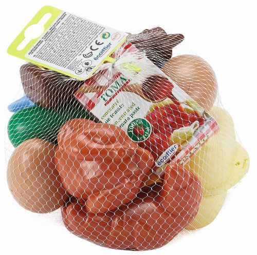 Makety různých potravin, v síťce. S touto sadou máte všechny ingredience pro perfektní snídani. Obsahuje balení vajíček a 2 vejce, kuře, párek, mrkev, okurku, croisant, rajskou omáčku a polevy. Ideální také jako vybavení obchodu nebo jako doplněk do dětské kuchyňky. Rozměry produktu (DxŠxV): 19 x 19 x 13 cm.