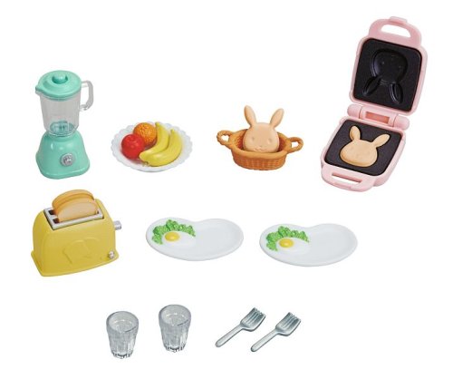 Snídaňová hrací sada obsahuje náčiní na snídani a vaření. Chléb lze vložit do výsuvného toustovače. Pohybem páčky připravte toasty. Užijte si ještě více zábavy při společné hře se sadou kuchyňského náčiní, jídelním stolem a dalším kuchyňským nábytkem (prodává se samostatně). Saha obsahuje: Toustovač, Toastový sendvičovač, Mixér, Šálek, Víko, Snídaňový talíř 2x, Miska, Košík, Vidlička 2x, 2x hrnek, Chléb 2x, Toastový sendvič 2x, Banán 2x, Jablko, Pomeranč (celkem 21 kusů). Stimuluje nápadité hraní rolí u dětí. Vhodné pro děti od tří let.