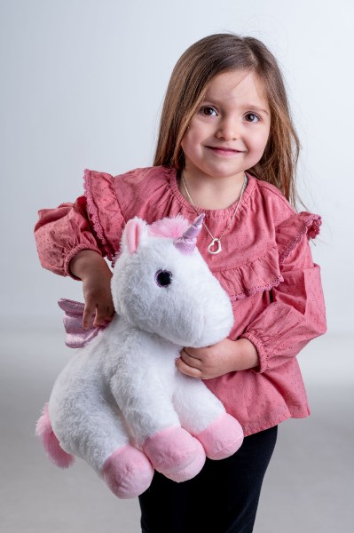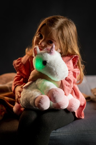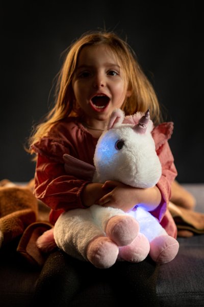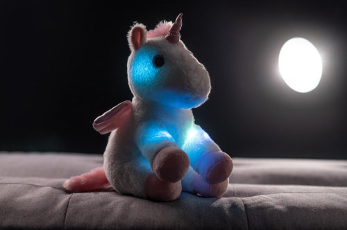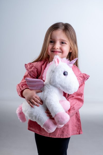 Roztomilý plyšový jednorožec s křídly je vyroben z kvalitní jemné plyše. Tento plyšový kousek je ideálním dárkem! Jednorožec s křídly pomáhá dětem snadněji usnout. Po zmáčknutí tlapky hraje klidnou relaxační hudbu. Ve tmě svítí a mění barvy. Velikost jednorožce: 38 cm Vhodné pro děti od 3 let