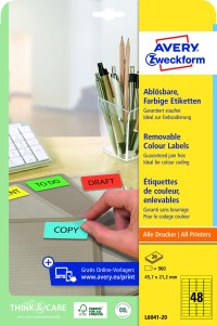 Snímatelné etikety Avery Zweckform žluté barvy - ideální pro barevné rozlišení dokumentů a složek Spolehlivě drží a jsou snímatelné bez zanechání stop po lepidle Bezproblémový průchod etiket tiskárnami …
