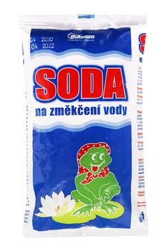 Soda na změkčení vody. Soda prášková zabraňuje tvorbě vodního kamene, také je vhodná na změkčení vody a k namáčení a praní velmi znečištěného prádla. Přidáním k pracímu prášku při praní v pračce zabraňuje tvorbě vodního kamene a šetří pračku.