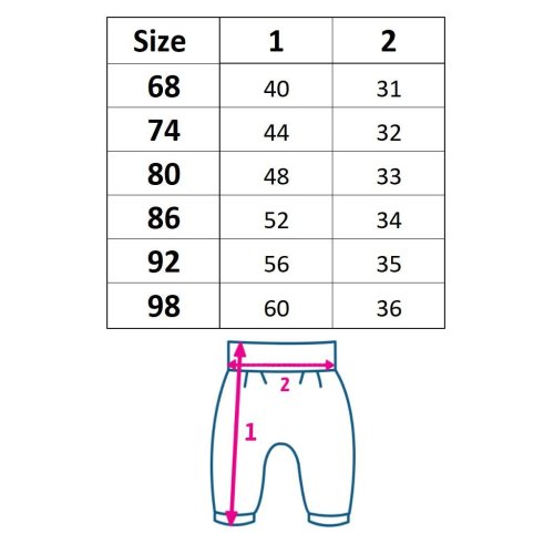 Nápadité softshellové kojenecké kalhoty New Baby. Kalhoty jsou vyrobeny v České republice z kvalitního materiálu softshell. Materiál je hladký, elestický, měkký a příjemný na dotek. Do určitého stupně je také voděodolný, nenasakuje vodu a je odolný vůči znečištění. V pase je našitá širší gumička, která netlačí na bříško miminka. Na nohavičkách jsou širší pružné lemy a ve vrchní části kalhot je našitá reflexní paspulka. Menší velikosti jsou velmi prakticky ušité, protože jsou v bocích dostatečně široké pro miminka, které nosí plínky. Celá vnitřní strana kalhot je zateplená krátko střiženým polarem, který zvyšuje komfort nošení a zajišťuje teplo. Softshellové kalhoty jsou vhodné jako sportovní oblečení, jsou odolné větru a zároveň prodyšné. Miminko se bude cítit velmi pohodlně a příjemně.<BR>Charakteristika softsellu:<BR>- tkanina se skládá ze 3 vrstev<BR>- vnější vrstva polyester<BR>- membrána<BR>- vnitřní vrstva, krátko střižený polar<BR>Složení:<BR>- polyester 100%, membrána TPU<BR>- gramáž 320 g/m2<BR>- vodní sloupec 10 000 mm<BR>- prodyšnost 3000 g/m2/24h<BR>Upozornění:<BR>Během praní nepoužívat aviváž. Charakteristické vlastnosti softshellu by byly znehodnoceny.<BR>Vyrobeno v ČR. <BR>Snažíme se vám výběr správné velikosti co nejvíce usnadnit, proto při fotografiích naleznete velikostní tabulku.