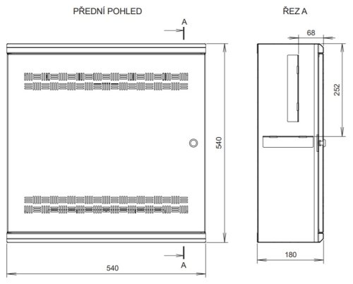 Zadní stěna obsahuje otvory pro montáž rozvaděče na zeď.
