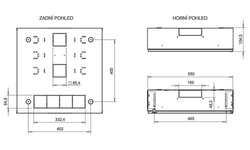 Vstup kabelů je možný předpřipravenými otvory v zádech i ve všech stěnách rozvaděče. V zadní části rozvaděče jsou připraveny otvory pro uchycení na zeď.
