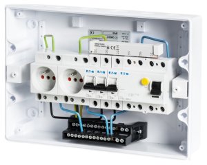 V rozvaděči je osazen jistič B16/1 pro jištění dvou zásuvek a jedné rezervy pro samostatný spotřebič ze zálohy střídače a proudový chránič typu A.