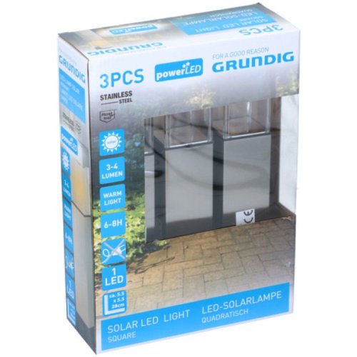 Svítidlo solární Grundig 0048, sada 3ksSada 3 kusů moderních zahradních svítidel je vhodná pro osvětlení přístupových cest, restauračních zahrádek, jako dekorace do rodinné zahrady či terasy. Po setmění svítí trvale, lze ho pak jednoduše vypnout pomocí tlačítka. Montáž je také velmi snadná - pomocí tyčky a bodce se svítidlo zapíchne na zvolené místo. Doporučujeme umístit svítidlo na dostatečně slunné místo s dobou svitu alespoň 4 hodiny denně. Plocha solárního panelu by se měla udržovat v čistotě a ničím nezakrývat.Technické parametry:- materiál nerez/plast- 1x LED dioda přírodní bílá- světelný tok: 3-4 lm- Ni-Mh akumulátor 1,2V / 600mAh- rozměry: 5,5 x 5,5 x 28 cm