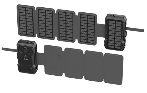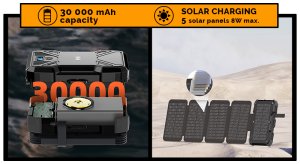 Solární powerbanka • Kapacita 30000mAh (111Wh) • podpora rychlonabíjení QC3.0 a Power Delivery • USB-C vstup až PD18W • USB-C výstup (PD20W max.) • 2 x USB-A výstup (QC22.5W max.) bezdrátové wireless nabíjení 15W max. • 5 solárních panelů 8W max • IP54 • LED svítilna