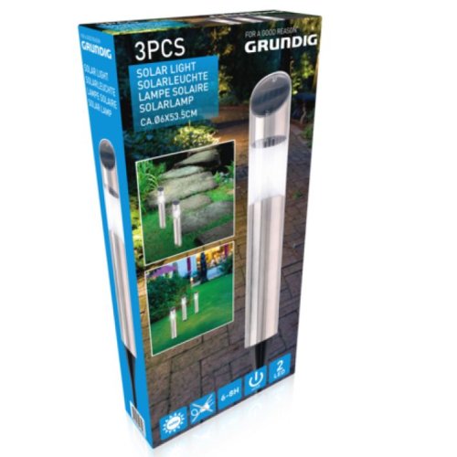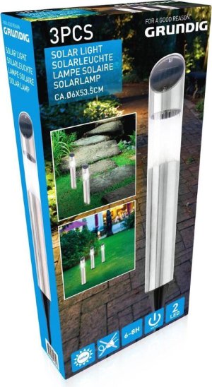 S těmito robustními solárními svítidly vyrobenými z nerezové oceli od Grundig můžete úžasně předvést svou zahradu. Každé solární svítidlo O6xH36cm je ukotveno v zemi pomocí přiloženého zemního bodce.Tělo svítidla je vyrobeno z nerezové oceli. Dekorativní vložka lampy z plastu se dvěma studenými bílými LED diodami dokonale završuje celkový design. Díky použité LED a solární technologii je toto osvětlení obzvlášť dlouhotrvající a energeticky úsporné.Světlo se během dne nabíjí solárním panelem a automaticky se zapíná při setmění pomocí integrovaného světelného senzoru.Podrobnosti sada solárního světla- Značka: Grundig- LED solární lampy včetně zemnícího hrotu- Tělo z nerezové oceli, stříbrná- Ozdobná vložka lampy z plastu- Solární napájení- Integrovaná baterie (1,2V typ AAA, Ni-MH 600mAh)- Světelný senzor- Zap. /vypínač (ve Světle)- Vysoká účinnost s nízkou spotřebou energie- každá 2x LED studená bílá (nelze vyměnit)- Celková velikost se zemním hrotem: O6xH53,5cmkaždá - Velikost každé solární lampy: O6xH36cm každá- Celková hmotnost: cca 0,8kg- Rozsah dodávky: 3x solární lampa včetně hrotu