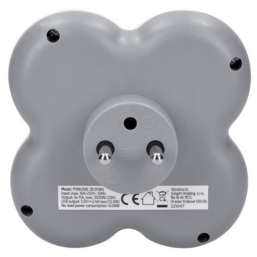 výstup 3x 16A, max. 3680W 1x USB A + 1x USB C nabíječka, max. 2400mA pootočená horní zásuvka dětské pojistky barva: bílá-šedá