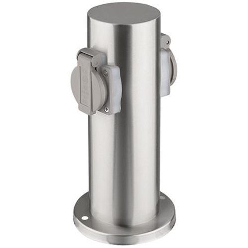 Specifikace elektrický rozvodný sloupek z nerezové oceli přívod elektrické energie do venkovních prostor, zahrad a sadů 2 zásuvky max. 16A, 3680W, dětské pojistky a samouzavíratelné krytky proti vlhkosti a prachu svorkovnice s uzemněním pro připojení přívodního kabelu uvnitř sloupku základna s montážními otvory do pevných povrchů barva: matná stříbrná (inox), šedé krytky zásuvek třída ochrany: IP44
