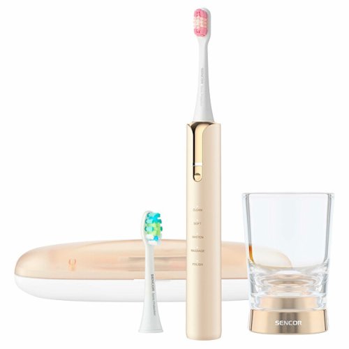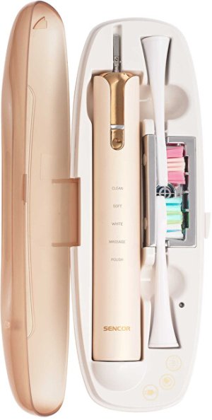 Sonický zubní kartáček Sencor SOC 4111GD nabízí profesionální péči o ústní dutinu v elegantním provedení. Disponuje 5 přednastavenými režimy pro čištění a regeneraci, přičemž dosahuje až 40 000 kmitů za minutu. Díky této technologii dokáže odstranit plak několikanásobně účinněji než běžné manuální čištění. Speciální kmitání je navrženo tak, aby zároveň pečovalo o zdraví vašich dásní. Chytrý časovač s technologií Quadpacer rozděluje čištění do čtyř rovnoměrných bloků pro maximální efektivitu. LED indikátor vás informuje o stavu baterie a ergonomická rukojeť zajišťuje pohodlnou manipulaci. Kartáček má velmi nízkou spotřebu energie a je voděodolný podle standardu IPX7, což znamená, že jej lze bezpečně používat i ve sprše. Výdrž baterie dosahuje až 45 dní při běžném každodenním použití. Výměnné kartáčkové hlavice zajišťují dlouhodobou hygienu a celosvětová kompatibilita napájení 100–240 V umožňuje bezproblémové použití kdekoli na světě. Balení obsahuje tělo kartáčku, dvě hlavice, indukční nabíječku, skleničku a přenosné pouzdro s USB konektorem a UV sterilizátorem. Pouzdro pojme jedno tělo kartáčku a buď dvě hlavice, nebo jednu hlavici a jednu zubní pastu.